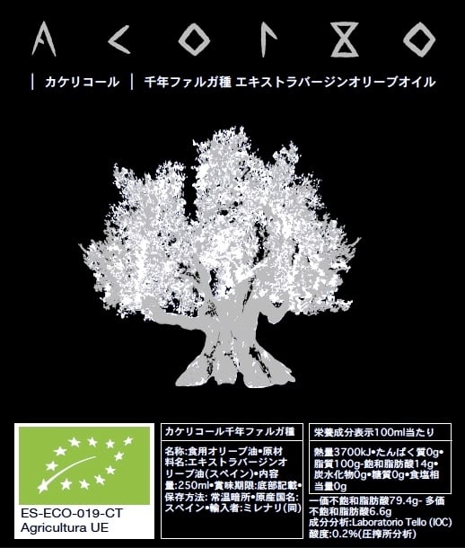 貴方のお手元にあるこのエキストラバージンオリーブオイルは、エコフレンドリーかつ伝統的な手法でファルガ種のオリーブより作られています。有機肥料以外はいかなる化学処理も施さず、 天然の性質、自然本来の特質と環境の生物多様性を守っています。スペイン・カステリョン県北部のサンマテウで10月半ばから11月初旬に地面に敷いた網に落として手摘みし、即座にコールドプレスを行っています。